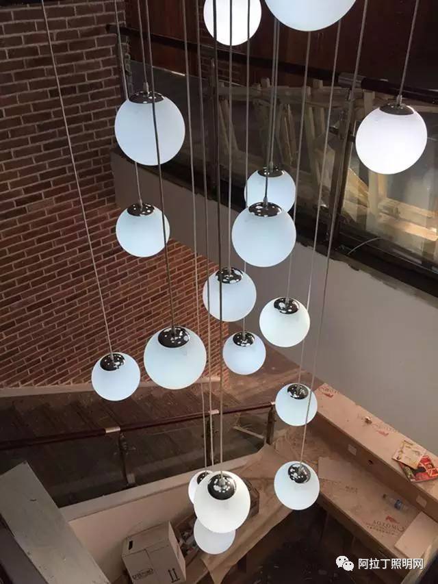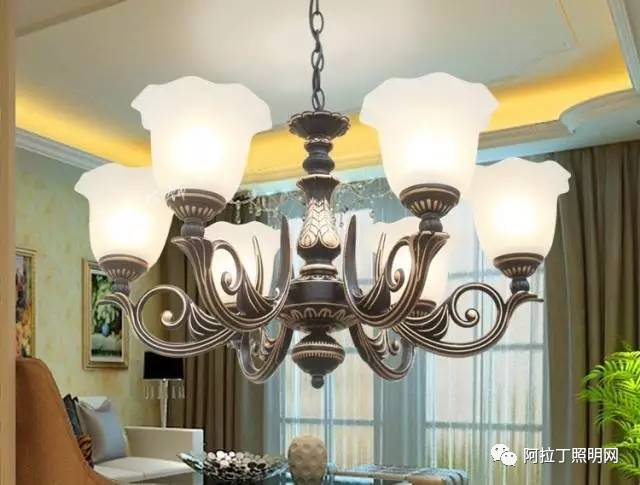 吊灯的灯罩有磨砂与彩色可选,一般情况下为了保证泛光效果,选择无色磨砂灯罩的比较多。