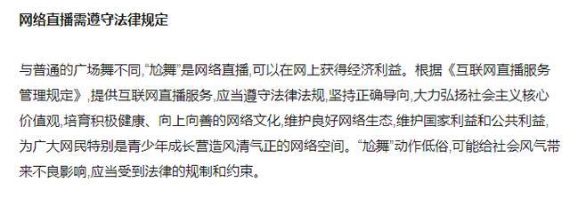 这或许是国内有影响力的媒体第一次对“尬舞”的集体负面报道。人民网的一篇文章直戳了“尬舞”要害:扰乱公园秩序事小,以哗众取宠在网上直播赚钱事大。