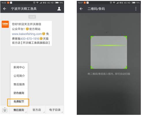 第一步☞关注公司官方微信公众号【宁波开沃精工渔具】 ▶第二步☞点击下方菜单栏“防伪查询” ▶第三步☞扫描竿背面的条形码/二维码▶第四步☞显示查询结果