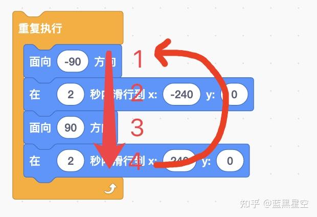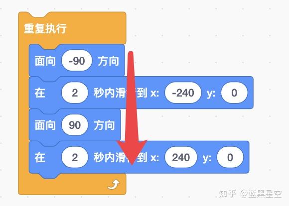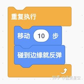 与之前不同的是,之前这4个积木按照从上至下1234的顺序执行完成以后,小鱼就会停止移动。现在它们被放进了重复执行积木中,当它们执行完成后,不会停止,而是会从第4个积木跳回第1个积木,重新开始执行,永不停止。