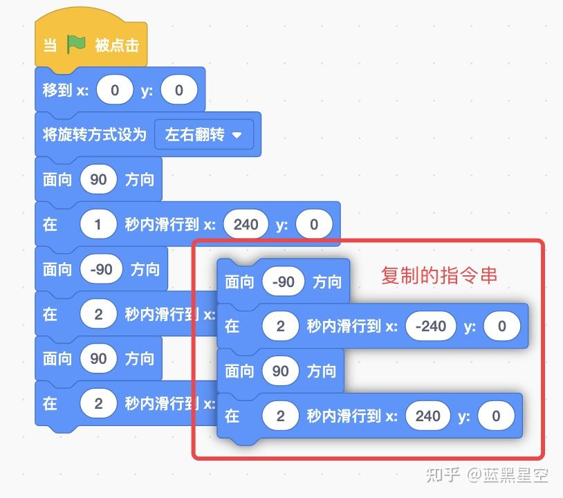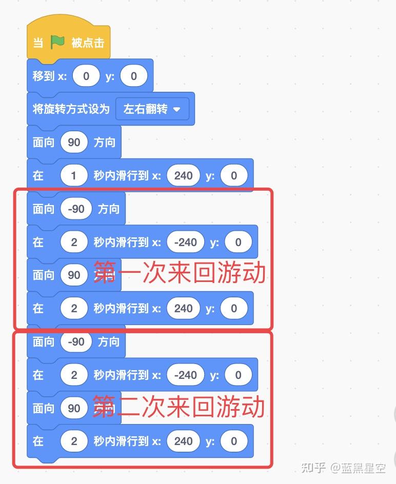 如果还想要它2次以后继续来回游动怎么办?是不是只要继续复制,继续拼接就可以了。但是这会有一个问题,无论你在指令串的后面复制了多少遍,这个指令串总会有执行完的时候,对不对?当指令串执行完时,小鱼就会停止移动。