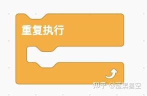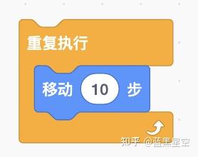 在控制分类中有一个重复执行积木。注意看这个积木的形状,是不是像一个张开的大嘴,在它的嘴里面可以放入其他的指令串。