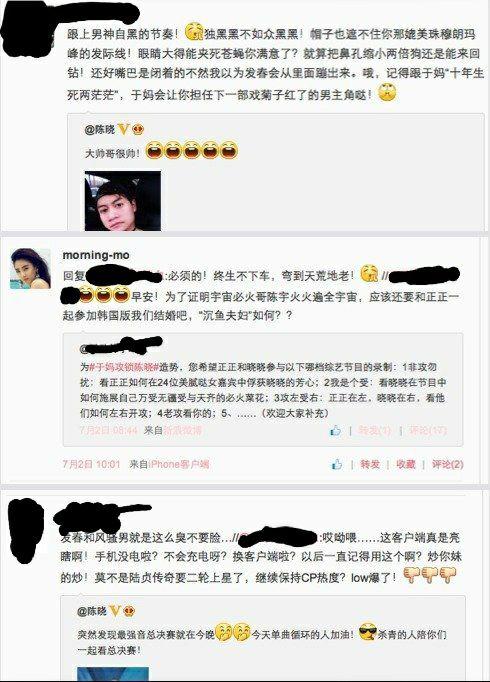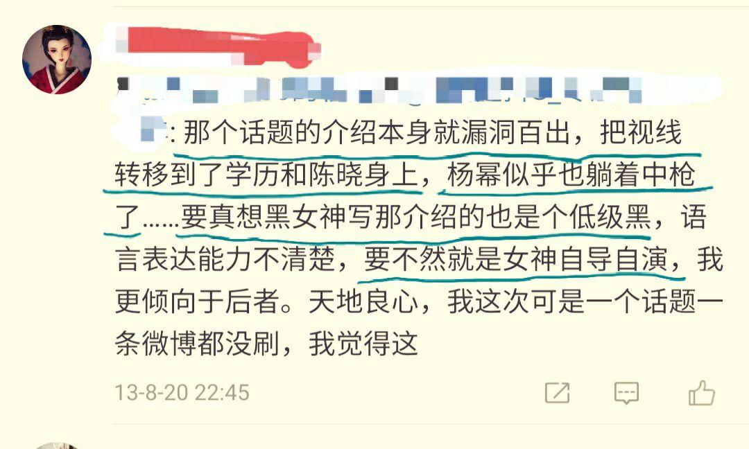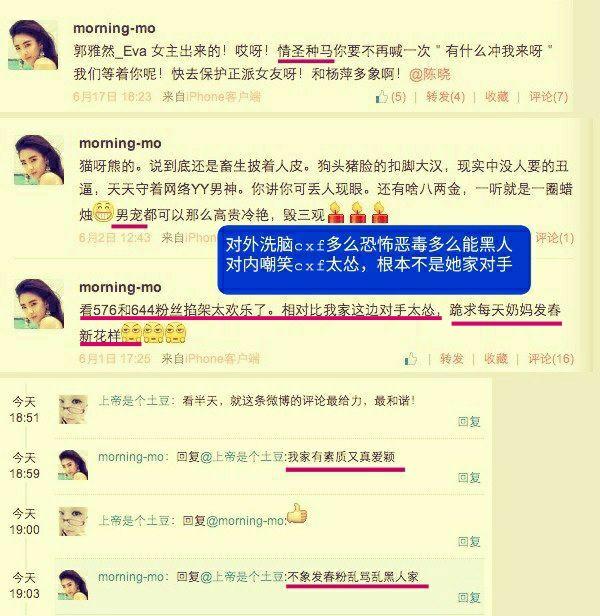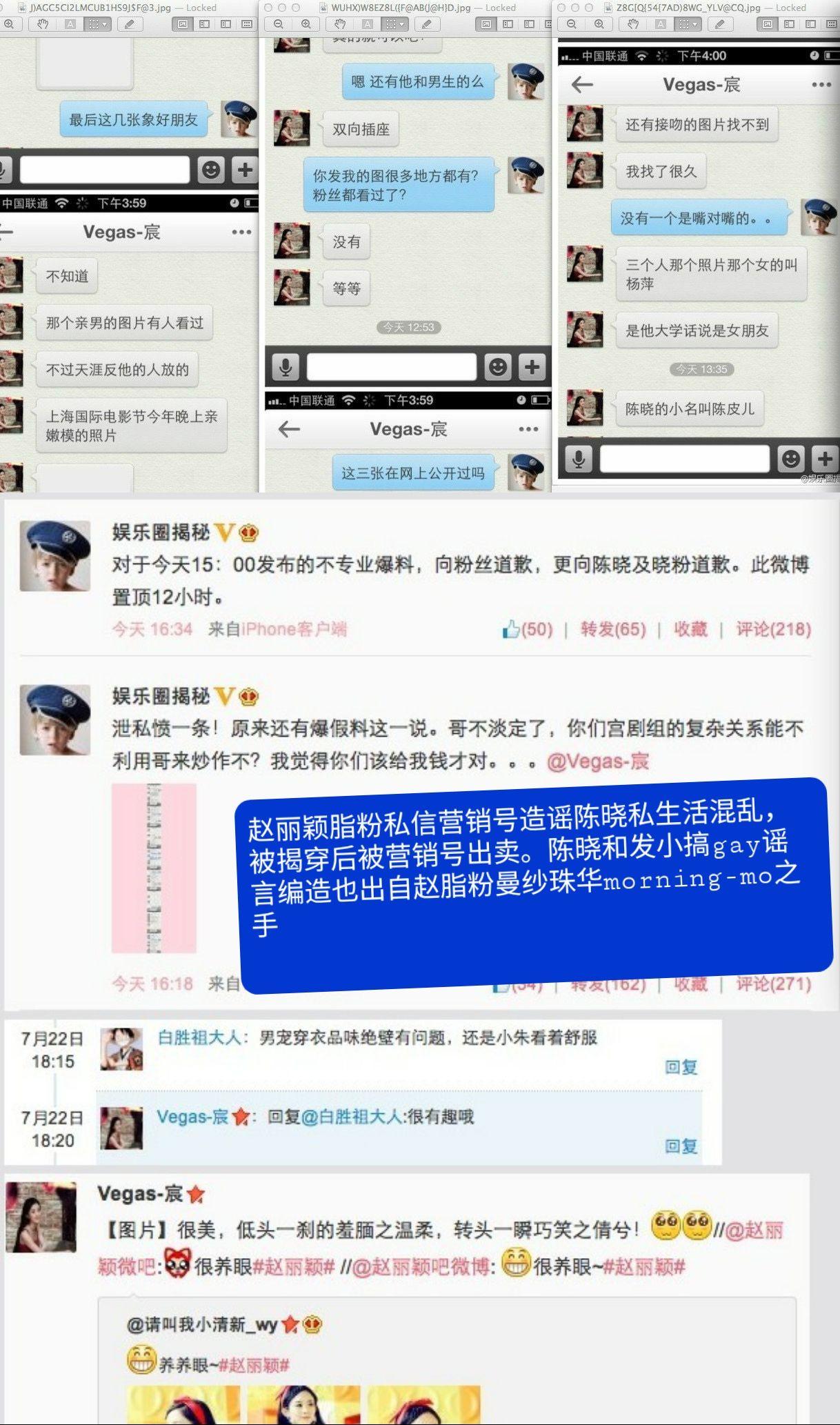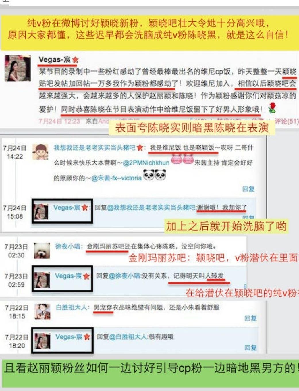 赵团队,一开始就控制了cp贴吧和粉群。当时赵团队人员包括前后两任经纪人,去天涯酸菜楼还有颖晓贴吧披皮爆料是经常的。而且还总是一边爆料一边暗搓搓踩cx(料的真假就先不提)
