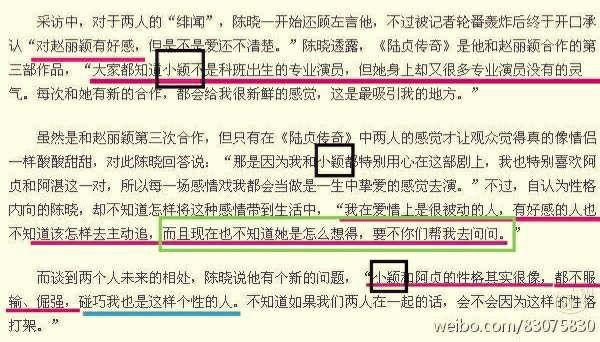 通稿内容如下图,结合cx的感情被动采访开始编故事,讲述cx对她的好感,借cx吹她表演的灵气,吹她的个性和陆贞的相像(当时z演员采访中都会夸自己和陆贞是一样,cx都是各种贬低自己,从来没说过自己个性像陆贞) 。在这些通稿中,cx向"记者" 称呼z演员为"小颖"。。。他何时如此肉麻过?