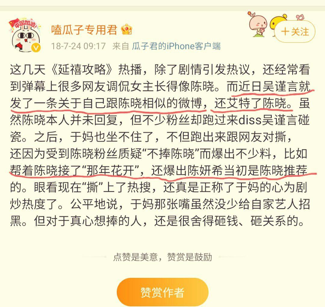 z粉在某个回答下黑他没良心,说他故意只宣传如意传不宣传yxgl。他已解约,宣传啥是他自由。而且于m当时为了炒热度,各种碰瓷他。z粉随主,有一句实话吗?
