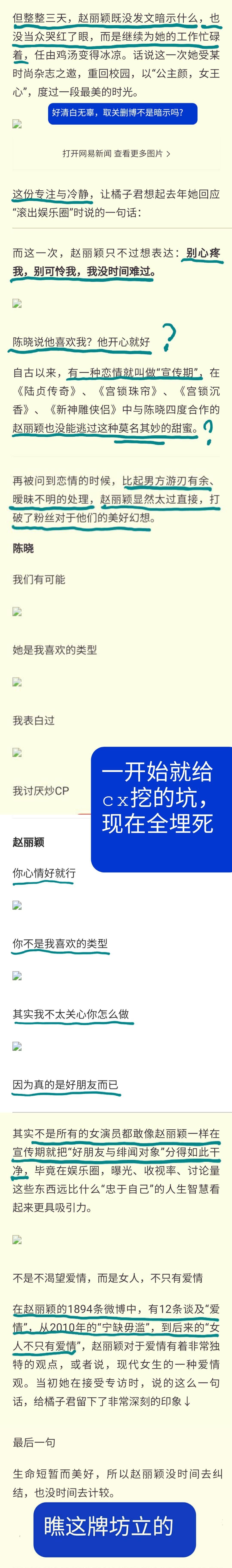 叙述扒皮赵丽颖到这里,我觉得要先暂停了,她对cx的sao操作扒都扒不尽的。回忆这些是顶着极大的生理心理ex。这些还只是能往外诉说的。更多自私下作不堪的内情,只能cx自己含冤在肚子里了。正如他同学们说的,知道内情的都会同情他,而不是说他