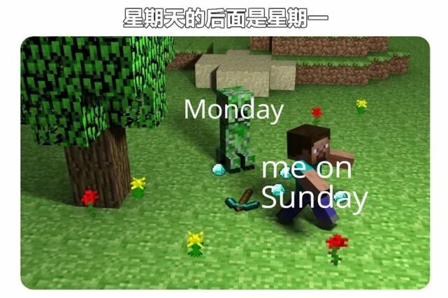 无论是上学党还是工作党,一周最喜欢的时候必定是周末,因为周末可以休息,可以安心躺在家里打游戏。虽然周末有两天,但是周六的感觉肯定是要比周日更好的,玩得也会更加尽兴。主要原因在于周六是休息的第一天,周日是休息的最后一天。第一天一般是没有什么顾虑的,父母也会让你放纵一下。而到了周日之后,下一天就是周一了,所以学生党要写作业,工作党要准备下周的工作。用MC作比喻就是,周一是苦力怕,它就在周日的身后。