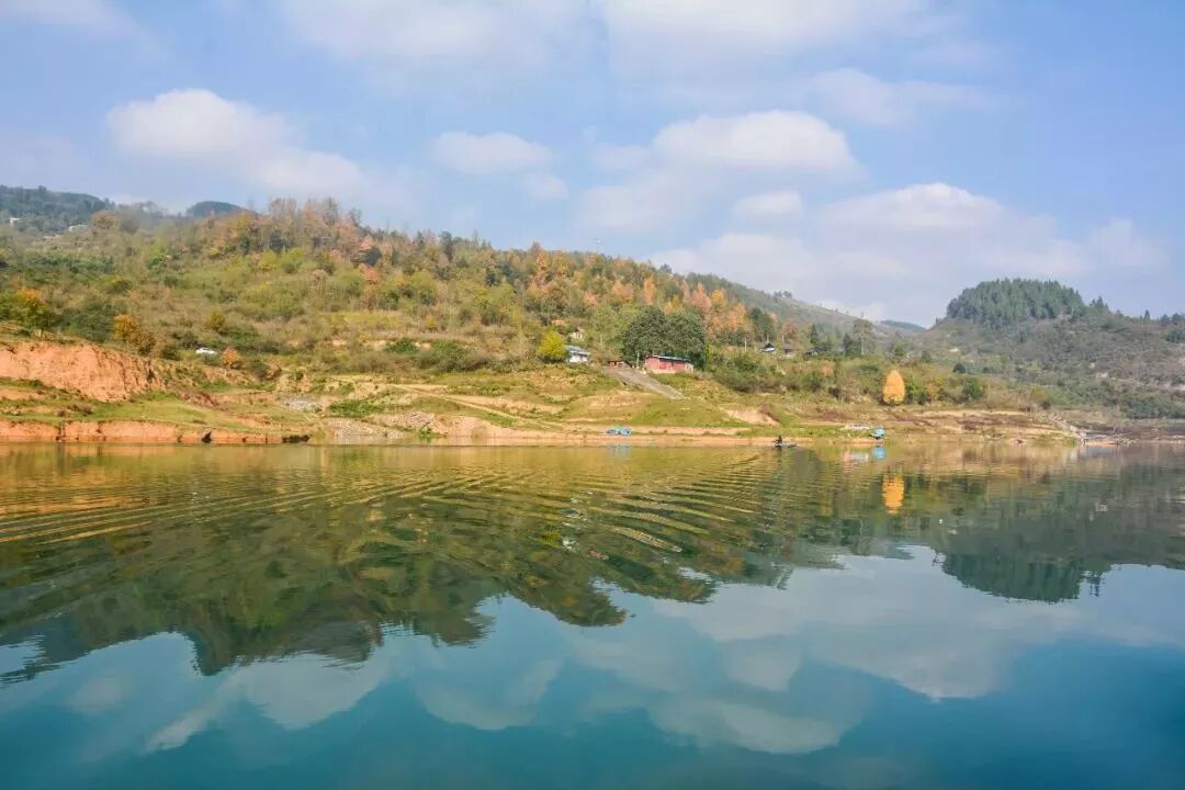 近观河水清澈透明,水中的细石游鱼尽收眼底,远处群山逶迤,树木倒映水中,形成山中有水,水中有山,山水相映的迷人景观。每当徐徐清风吹过,带着雨水的味道,令人心旷神怡。