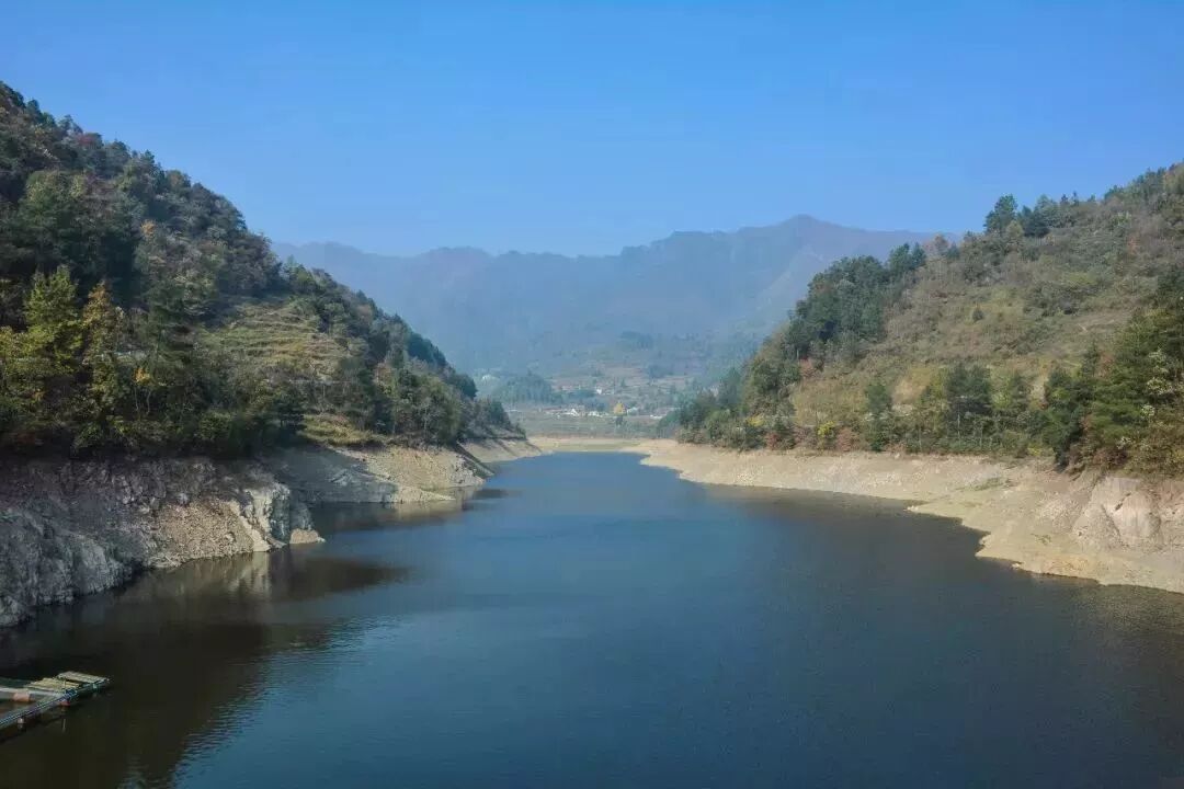 茅栗漩塘群山相拥,万仞石壁,怪石嶙峋,杂树丛生。流水孱孱,白鹤群舞。一阵微风吹过,河面波光粼粼。