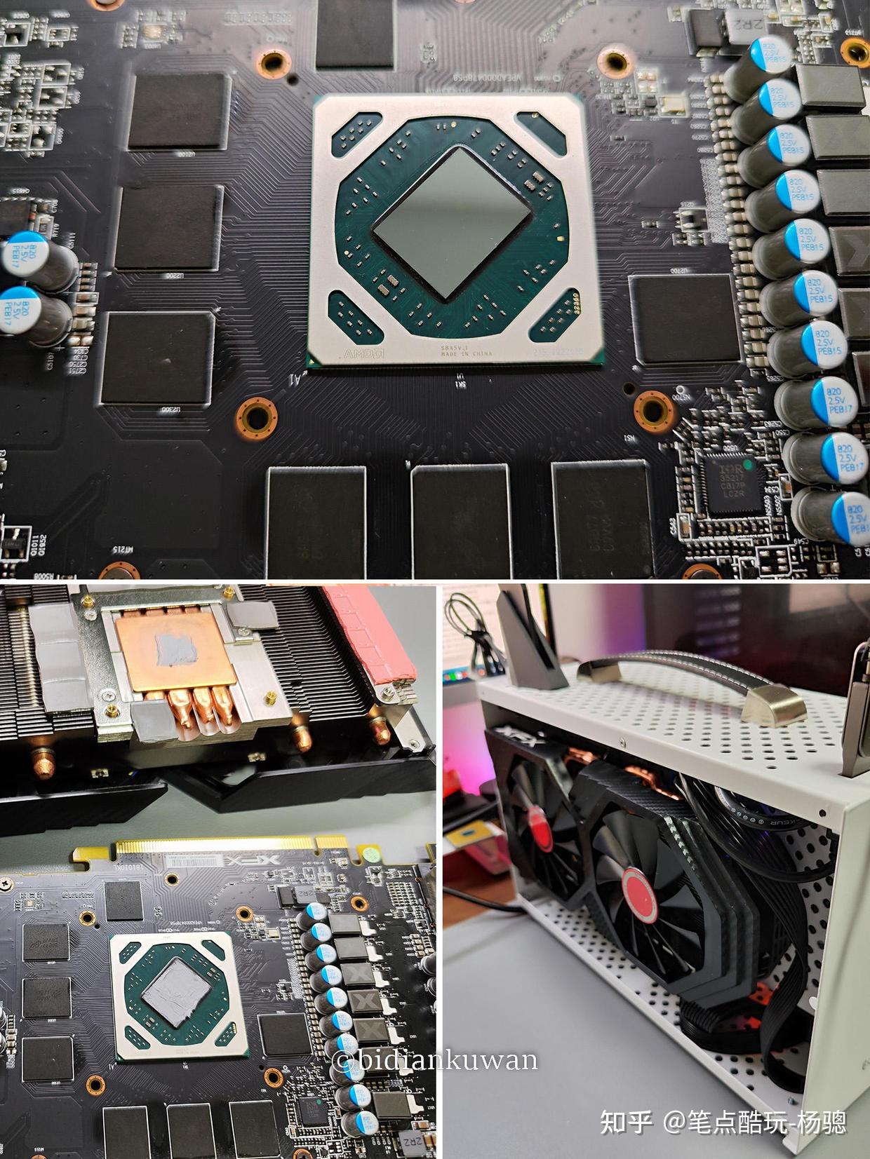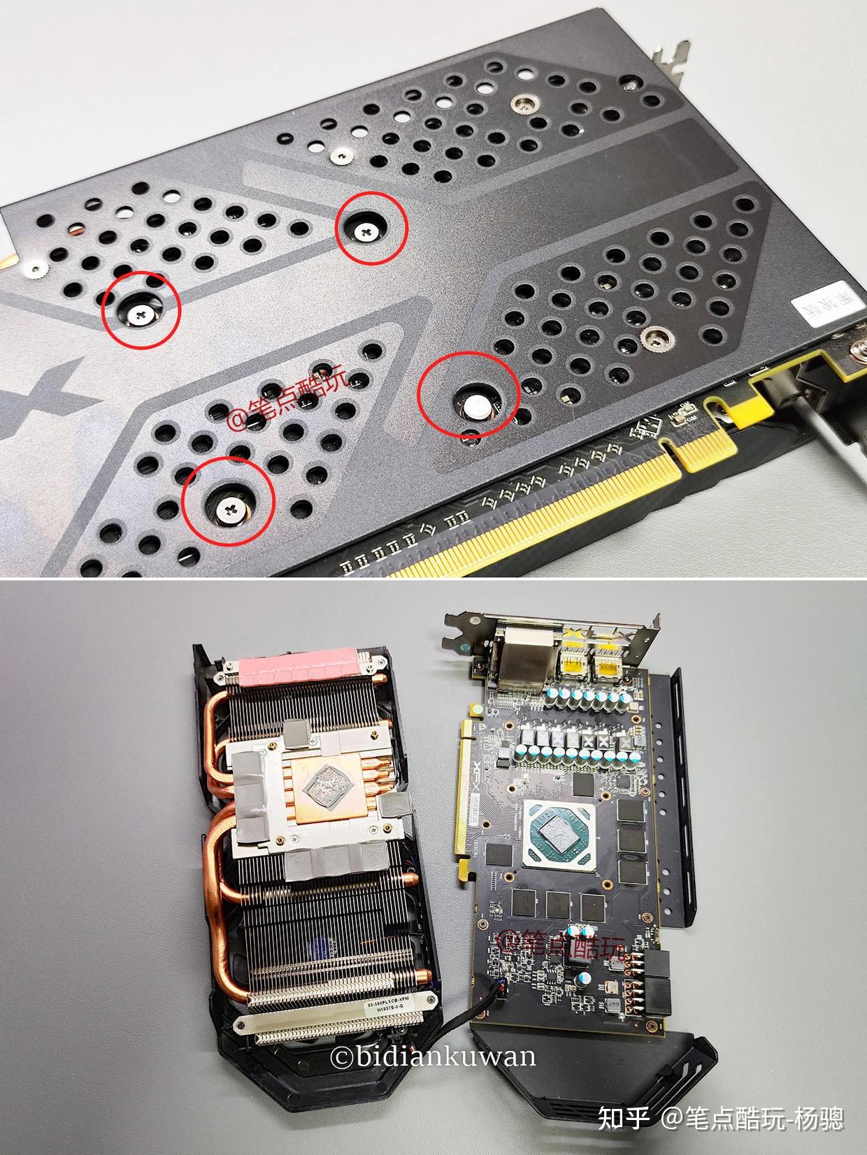 在我装好这块显卡之后,就直接开机做了两轮跑分测试,结果无一例外在显卡测试环节栽了跟头,还有一次是打开原神,仅仅是停在游戏界面挂机20分钟就又出现了之前的黑屏+键鼠控制无反应+显卡风扇以恒定高速猛转不停的情况。考虑再三我决定岔拆开看看这货到底是啥情况。如下图所示,拧掉散热器的固定螺丝即可前后分离,露出芯片,当然,保修贴也被破坏了(当然,3年质保期早过了)。