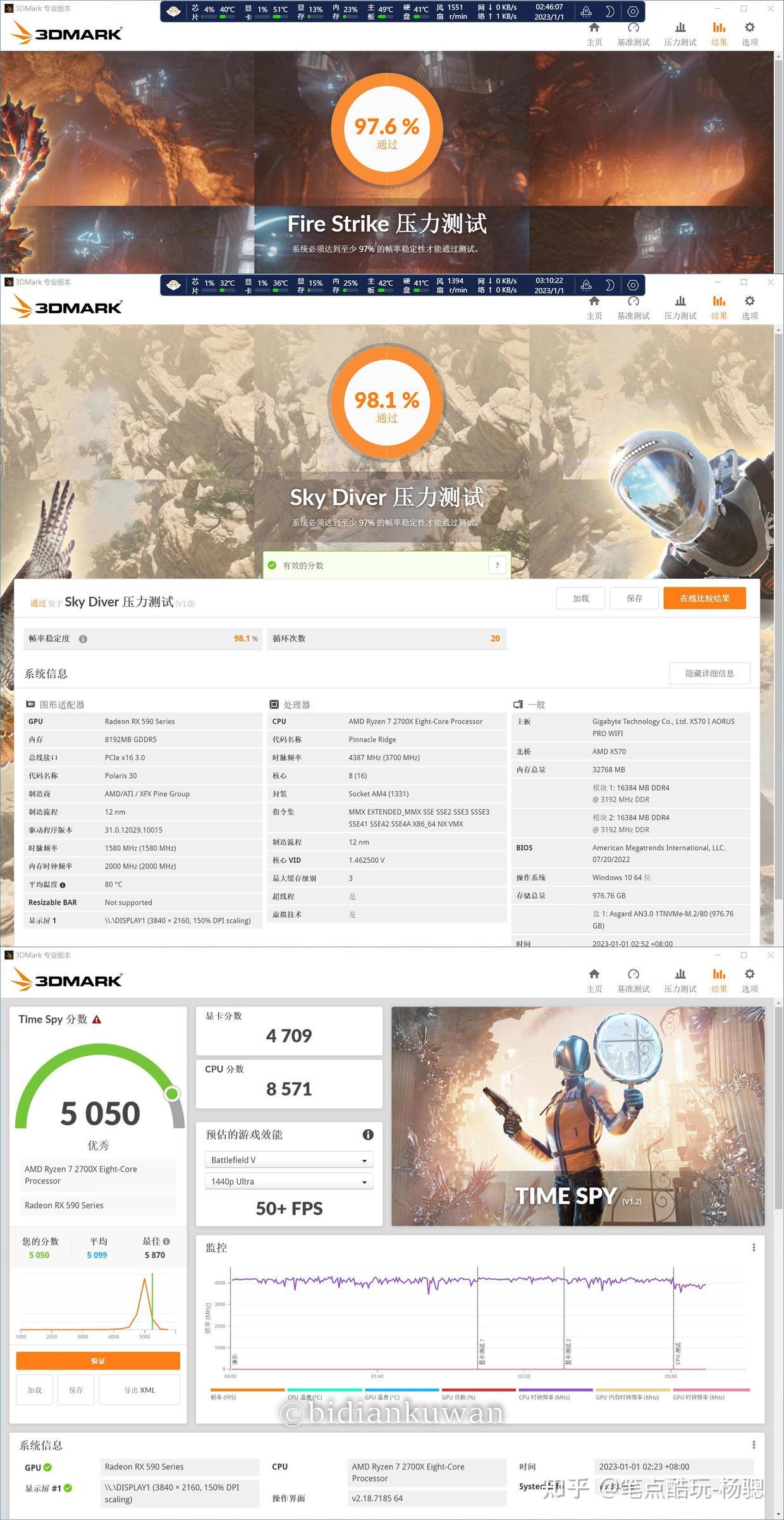 下图是我用3DMark分别做了20次的Fire Strike和20次Sky Drive,两组压力测试全部顺利通过;3Dmark的Time Spy跑分结果为5050。在2700x+RX590面前,2400G的核显确实不堪一击。