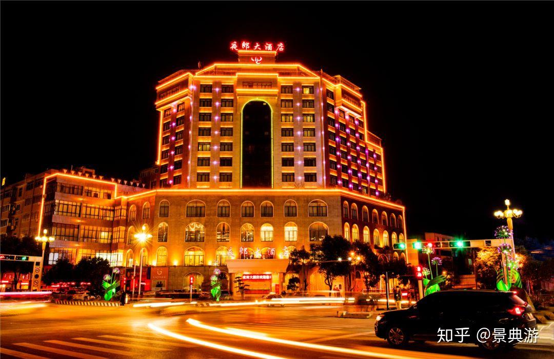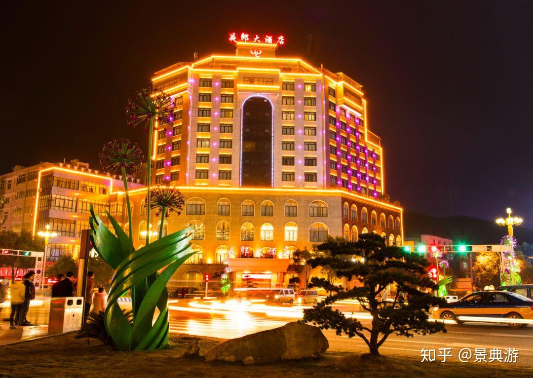 夜色中的夜郎大酒店灯火通明,流光溢彩。酒店地处县城中心,交通便利。是毕节市第一家星级酒店。