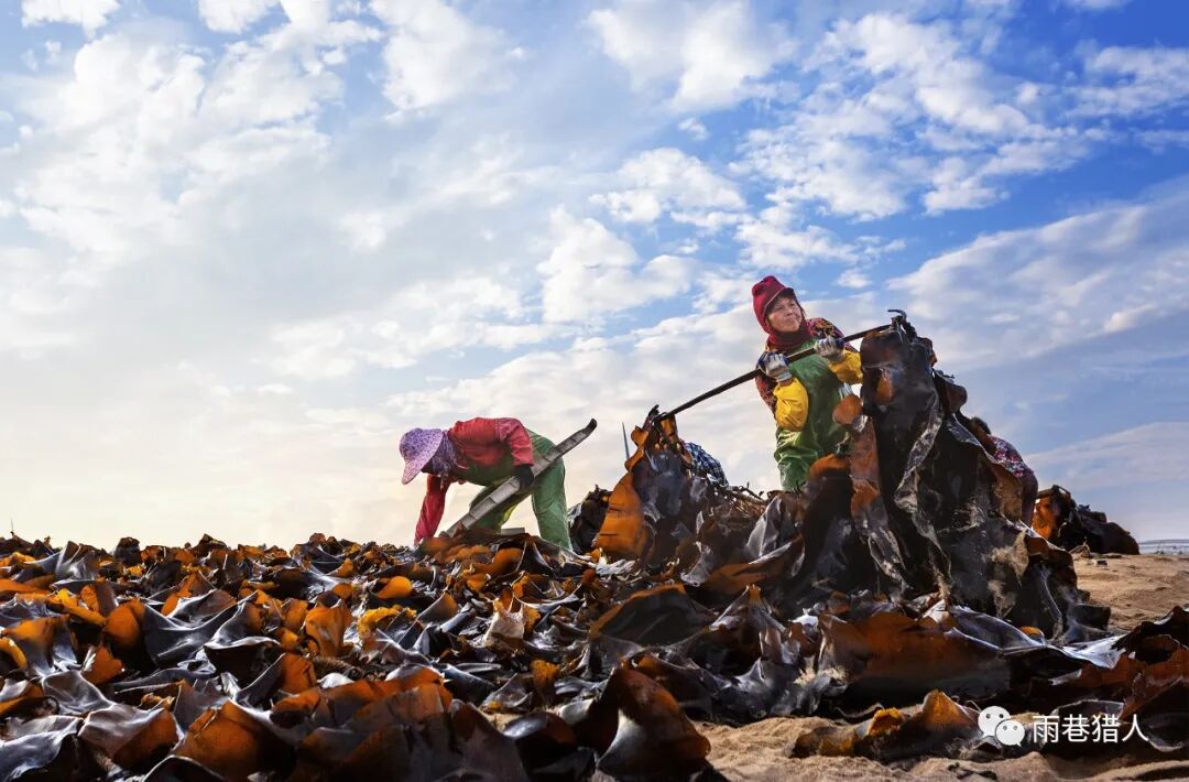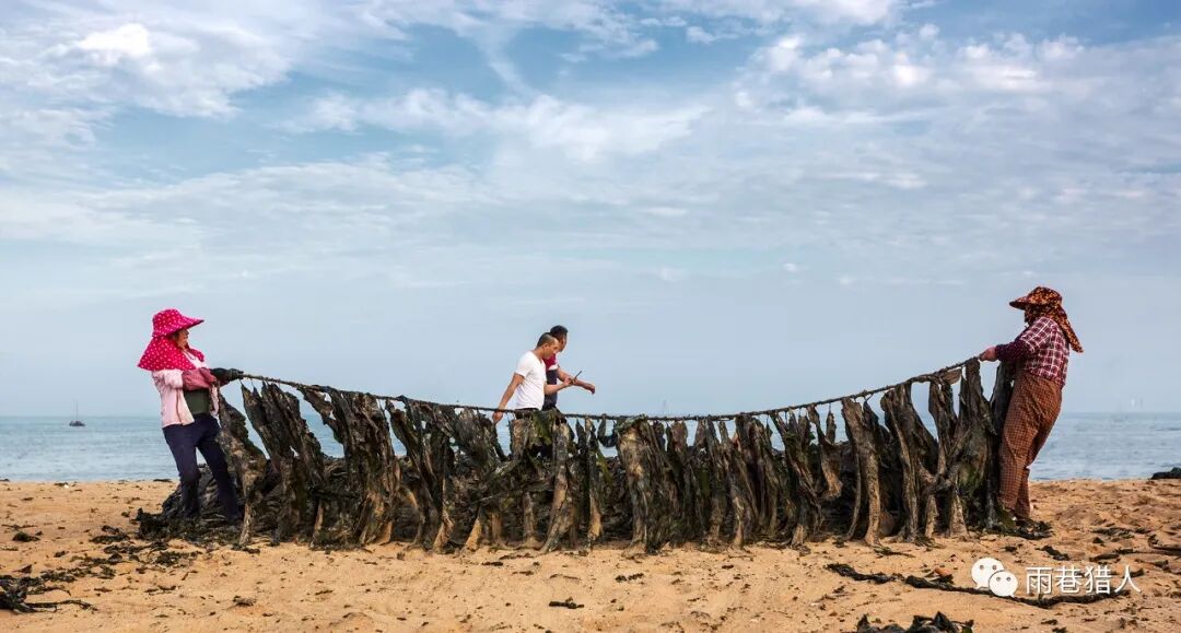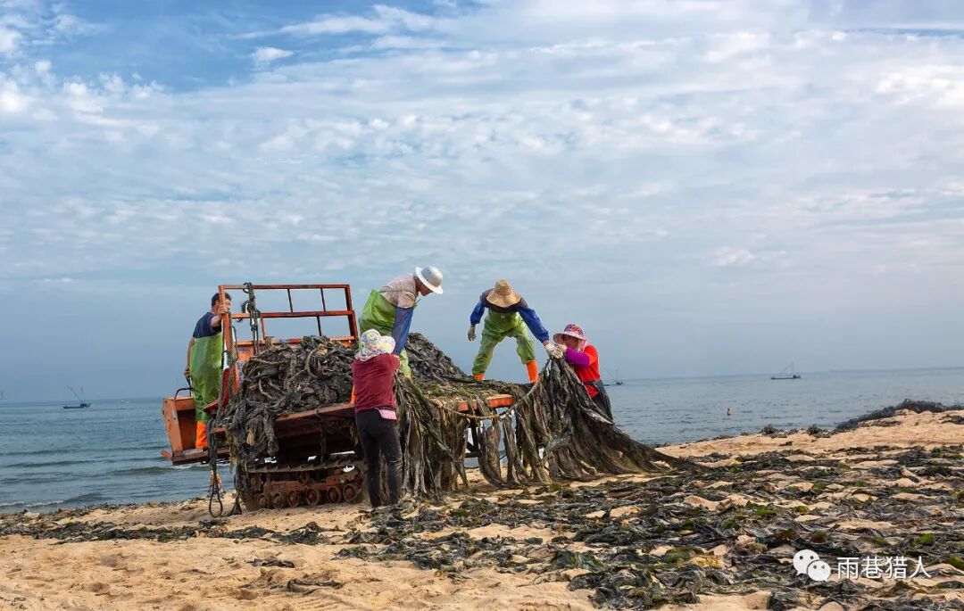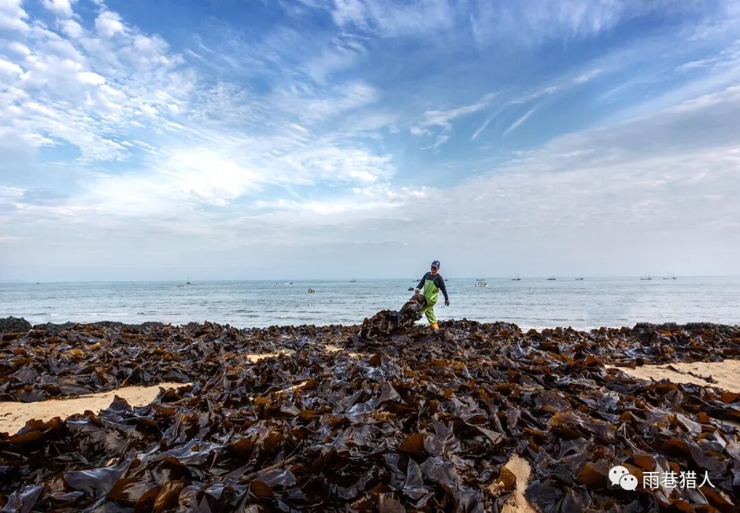 平海嵌头临海没错,平海嵌头黄金沙滩是沙滩,也没错。只是嵌头的沙滩没有黄金,或者没有我们已经习惯称之为黄金的黄金。嵌头的沙滩只有海带,一望无际的海带,眼之所及黑压压的一片,很壮观,倒觉得应叫“嵌头海带沙滩”更贴切一些。去之前,不知道这沙滩有这么个响亮的前缀,一导航吓一跳,还“黄金”呢,看到了“黄金”自然就提升了对这片沙滩的期待。然而,在窄小的村道上堵了一个多小时车,又忍受着咸涩的海腥味和海带霉臭味的刺鼻,心里虽有点小小的怨气,但还真没有多大的失望,因为海还是那片海,沙滩还是那沙滩,至于黄金也好,海带也罢,换个角度看看不就得了!