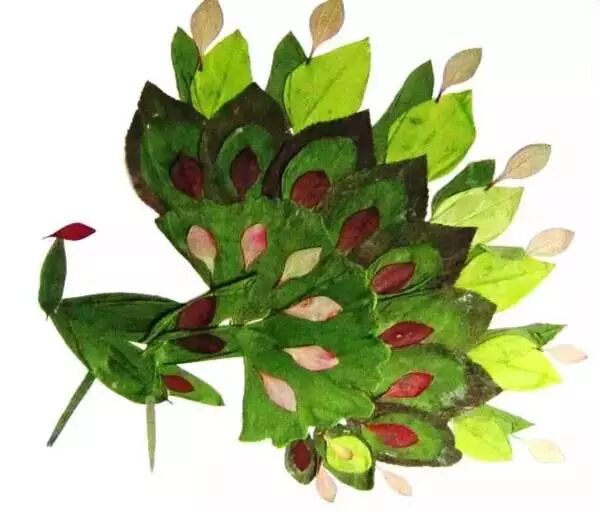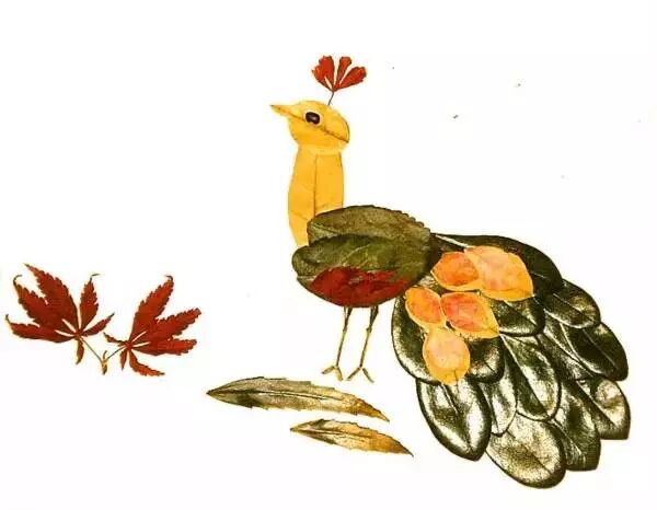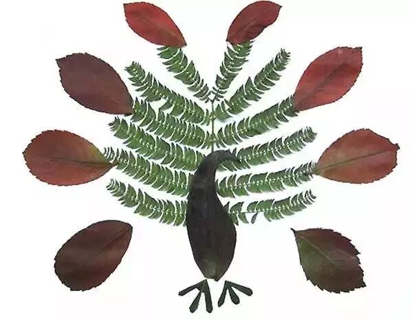 利用树叶可以做很多风景、动物、器物的粘贴画。但是,一个画面的好坏,主要取决于树叶的形状与颜色的选择、搭配。同种大小、颜色不同的树叶在一起搭配粘贴能表现很多的内容。同时要兼顾树叶之间颜色的对比,色度的黑、白、灰。主体部分的色彩不宜大鲜艳,细节部分的色彩可鲜艳一些,这样交错搭配画面就比较协调。例如,准备粘贴一幅“孔雀开屏”的画面,可以选择绿色的柳树叶叠放成扇状,在孔雀屏空隙处摆放两层红与黄的柳树叶,正面放一叶浅黄色的柳树叶做孔雀的身体,用叶梗做孔雀的腿,这样,一只向每一位参观者展示自己丰姿的绿孔雀就完成了。如果想粘贴一幅“葡萄”的画面,可以用大小不同、颜色不同的树叶相互叠放后形成硕果累累画面后,由两片大菱形葡萄叶完成整幅画面。