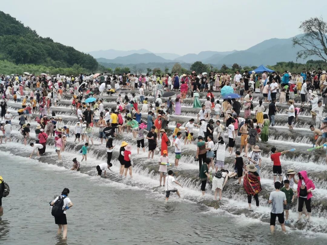 【浙江新昌"抖音网红免费景点"交通拥堵近4公里,公安部门发出紧急提醒】鹅卵石铺筑的坝顶、蜿蜒曲折的叠式堰坝、倾泻而下的水流形成层层叠叠的白色水花,新昌县羽林街道枫家潭"抖音网红免费景点"吸引全省四面八方的游客前来打卡游玩。
