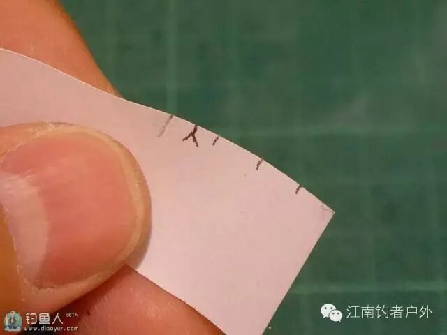 同样地将标身顶部分成四个等分,用模具画出要切割的地方,惟要注意在最前端要留2mm作为纸口,其作用是增加素材与标示杆的接触面,使素材能坚固地与标示杆接合。