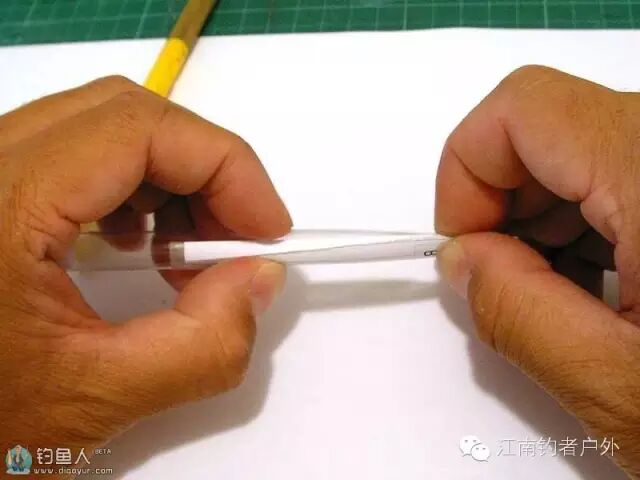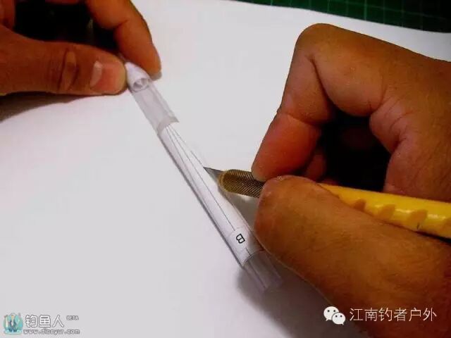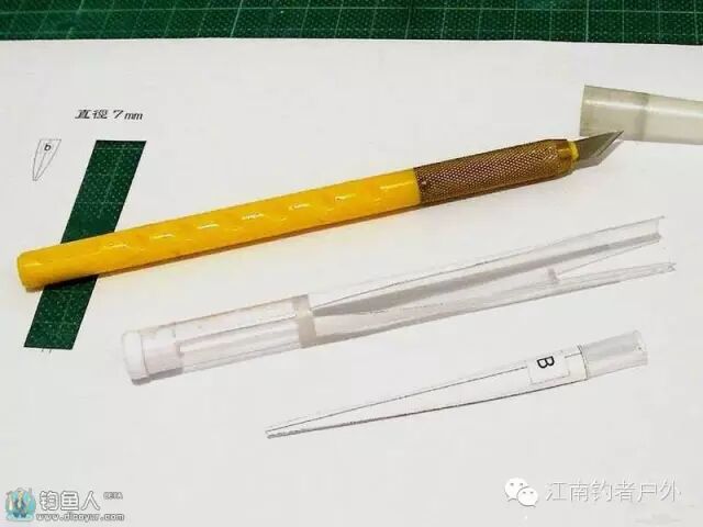 将模具打印在纸上,并将纸样剪下,再用双面胶纸贴上PVC胶管上(可使用承载商品浮标或纤维捧的胶管)。在顶端较阔的一面留1至1.5cm空位。