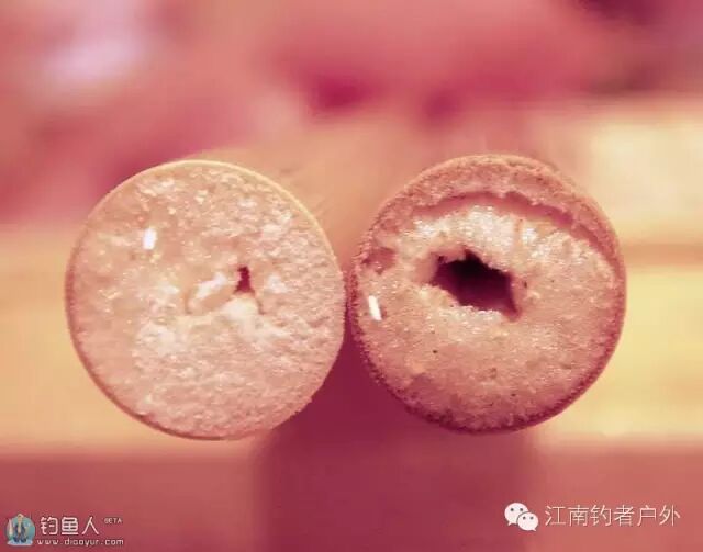 同时左手面一支素材较为嫩身,外层纤维部份较薄,比重亦较轻,做出来的浮标亦会偏向灵敏。但缺点是因外层纤维薄,做成浮标后可供修改的空间较小,而且标体 亦会较为单薄不耐碰撞,容易受到损坏。右手面一支素材较为老身,外层纤维部份较厚,但好处是做出来的浮标可供修改的空间较阔,而且标体亦会较为扎实耐碰。