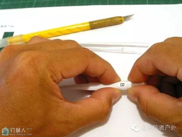 将电批扭力调较至最弱。并将浮标尾部紧夹,用砂纸轻轻按着浮标,开动电批将浮标打磨至圆滑。按着砂纸所使用的力度必须要轻,不然碳纤维棒会被扭伤甚至破坏整支浮标。此时必须要有耐心保持一个适当的力度慢慢地进行打磨。