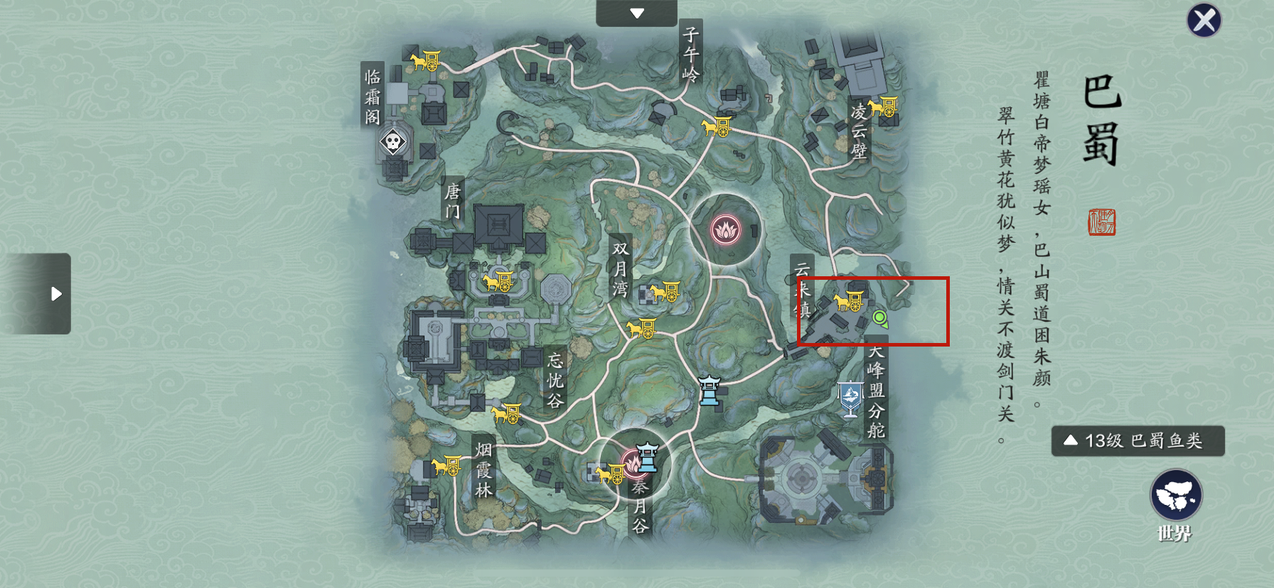 云南鯝:垂钓需达到钓鱼等级30级,位于巴蜀地图最右侧,最近的传送点是云来镇。