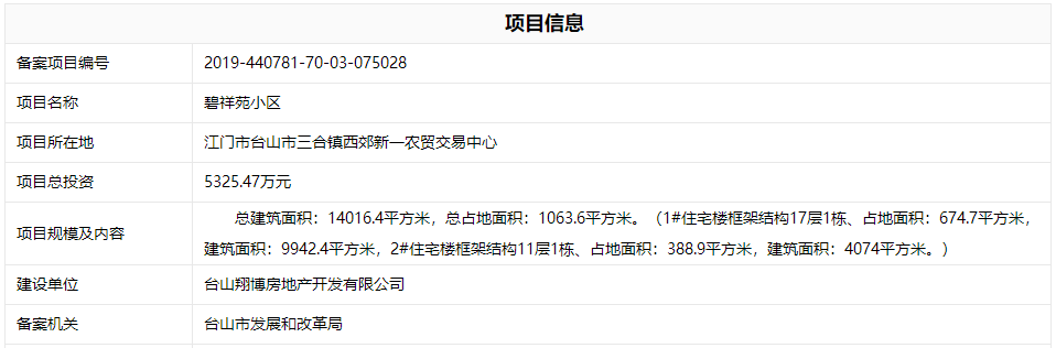 近日,广东省投资项目在线审批监管平台发布碧祥苑小区项目备案公示:
