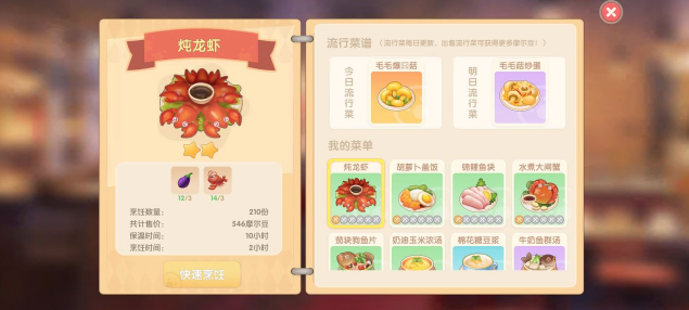 3)餐厅烹饪在红色灶台按这些菜的快速烹饪就好,需在菜品完成后才加经验。