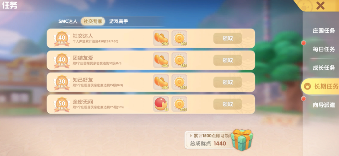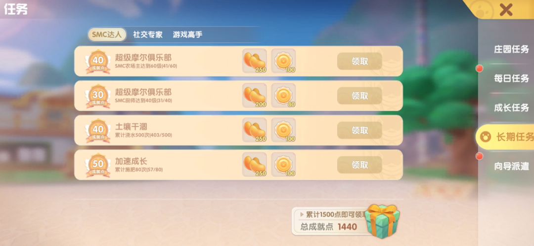 长期任务分为三个小类,SMC达人基本都是成就类任务,需要稍微肝一下。