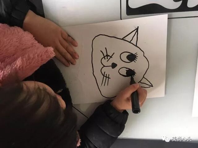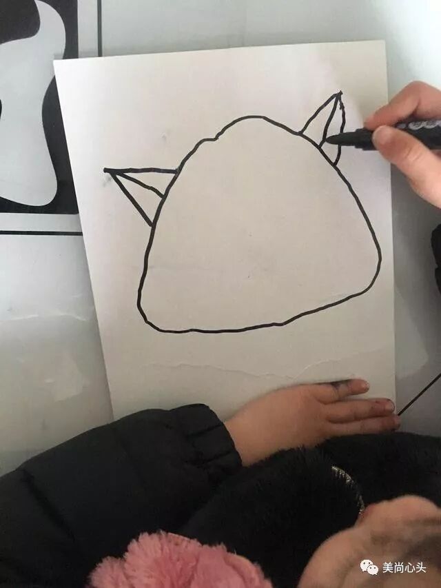 首先,我们先用记号笔画出可爱的小猫。爸爸妈妈们可以给小朋友看一些小猫咪图片,引导他们观察猫咪的特征,比如:猫咪的尖尖耳朵、圆圆眼睛、长长胡须等。