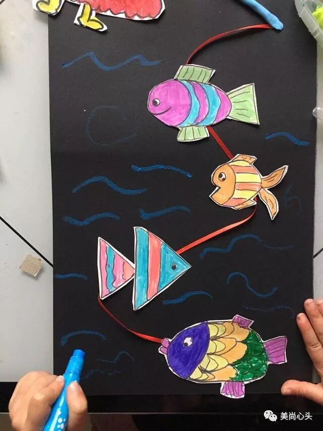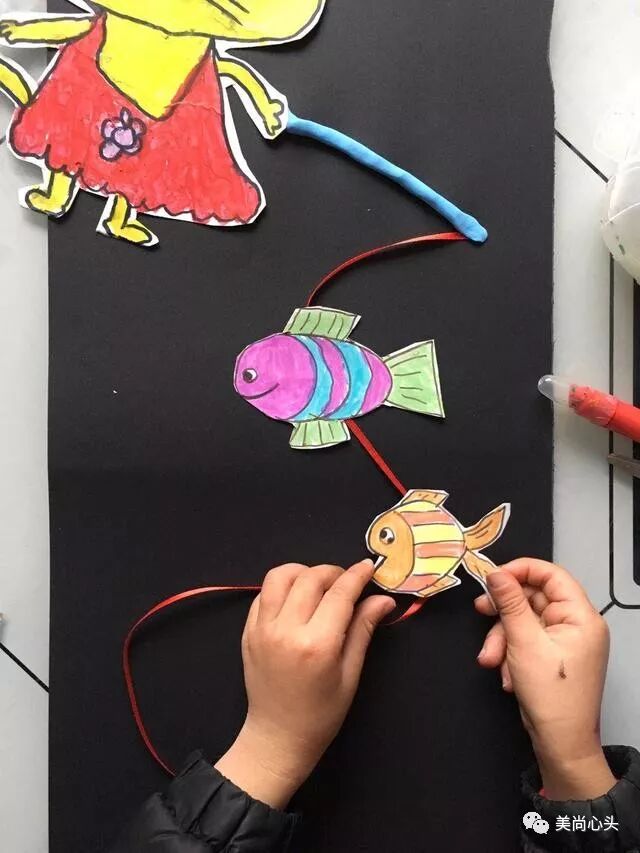 然后,我们用超轻粘土做一根鱼竿,家里没有超轻粘土可以直接画出来。再找一根绳子代替鱼线,把小鱼一条条放在合适的位置,贴在黑色卡纸上。