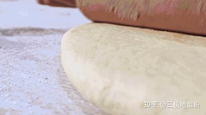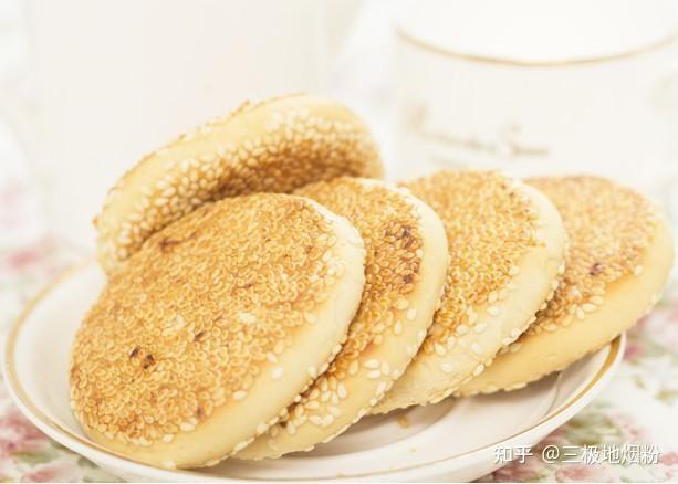 二、案板上抹匀芝麻油,取出饧好的面坨,在案板上按成长方形薄面皮,从两端向中间卷成双筒状,拉成约一半长条,再侧着从两端向中间卷成一个大、一个小的圆饼,将大圆饼放底层,小圆饼叠在上面,复放在盛芝麻油的瓷盘里浸没,约饧5分钟成饼坯。