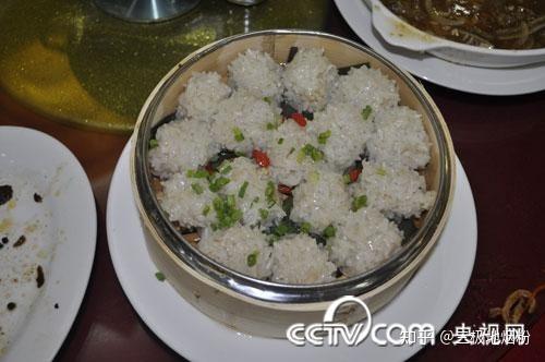 糯米淘净用清水浸泡2-3小时,用簸箕沥干待用;猪肉、鱼肉剁茸入盆,加精盐、姜末、葱花、胡椒、味精,打入鸡蛋合匀,再加入淀粉和水450克,搅拌上劲,挤成约15克重的圆子,放入糯米中滚动,待圆子裹满糯米,一个个摆入蒸笼(滚糯米时不能左手上弹,以免糯米贴进肉内翘不起来),坐旺火蒸约15-20分钟取出,用手一个个码入盘,撒少许葱花即成。如盘内用绿荷垫底,更显糯米色白晶莹。
