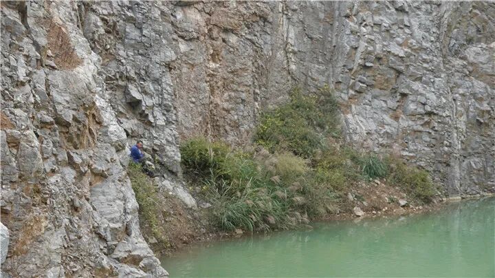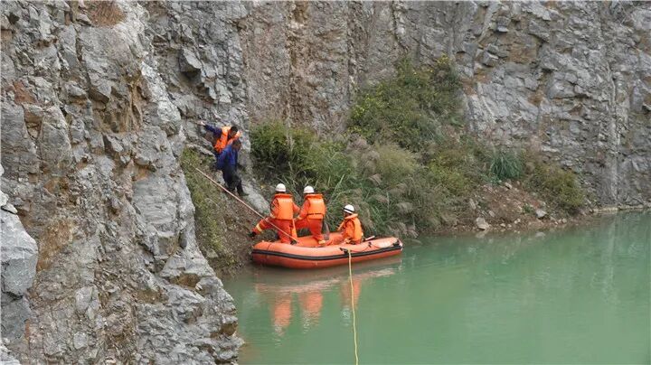 消防队员到达现场,据现场村民反映,该水塘是一个废弃的沙场,是因挖掘作业涌出的大量地下水而形成的,塘水深3米,宽约12米,男子正在悬崖壁塘边乱石块上,等待着救援。