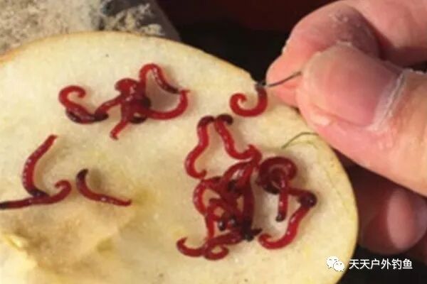 红虫是非常好用的活饵,在冬春季节使用较多。红虫的用法较多,最常见的就是单条挂钩,如果是公虫个头大一些还好挂,母虫小而且柔软,要直接挂钩使用就需要借助工具了。民间高手就是使用萝卜一片、土豆一片、白菜帮子、泡沫板就可以了,把红虫放在上面,用鱼钩扎过去;或者把红虫用红线捆起来挂钩,可以用木夹子,或者小木棒锯出十字沟槽,先放上红线,横着放几条红虫,红线绑起来就可以了。