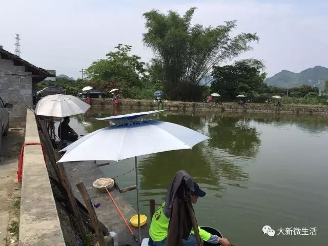 天很热,但远远就能看见很多遮阳伞散布在钓场周边