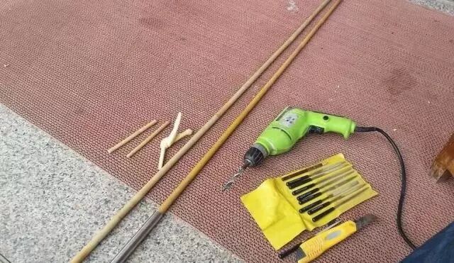4.将后二节打通(用工具从两头钻竹节,钻通了再扩大,最后把竹竿内空完全锉光滑),竿尖装入二节、二节装入尾节,收竿长约1.7米。