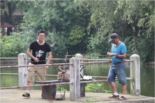 图1:和平公园水面上有不少漂浮垃圾;图2:我组成员和湖边钓鱼的居民进行交谈。