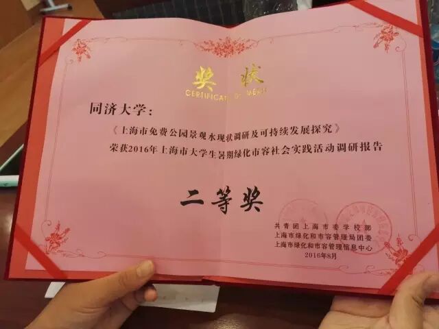 本次暑期实践让我们走出校园,将目光投向市民生活,运用自己在课堂上学到的知识尝试发现问题、分析问题,从而对解决问题提出自己的看法。本项目荣获得2016年上海市大学生暑期绿化市容社会实践活动调研报告二等奖。
