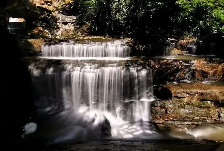 南宝山大瀑布:河道峡谷,峰高峡深,飞瀑流泉,变化多端。两边古树枯藤,中间瀑布涧泉,云蒸雾绕,时而响场如雷,时而寂静无声,偶有彩虹飞挂,一眼望去,俨然就是“飞流直下三千尺”的豪迈气势。