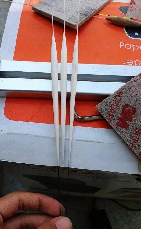过程省略一个半钟,一套三支,漂脚长度一样,漂身长度一样,直径不一样,漂尾长度不一样。前两天开始做的,所以还没开始上漆,只能到这里了,下面是之前做的一些浮标。