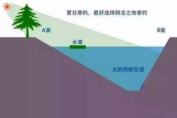通俗来说,应该是坐东朝西会比较好。或是我们在垂钓的时候,有大树笼罩水面,而阳光很少能照射到地的地方。或是有大量水草浮于水中,阳光不能直接到水下时,我们可以选择在水草中开洞,钓草洞也是不错的选择。如图的A面和水草下: