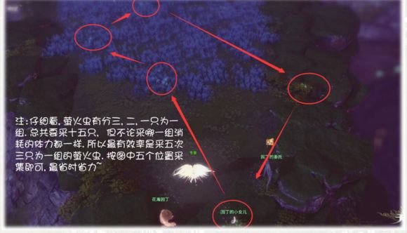 但注意,萤火虫是有分一只,两只,三只为一组的,任务需要抓15只,请着下图攻略,提高效率
