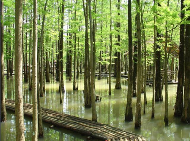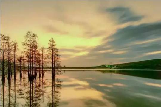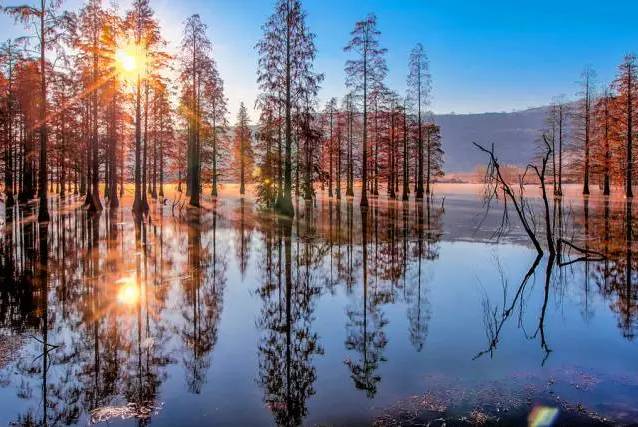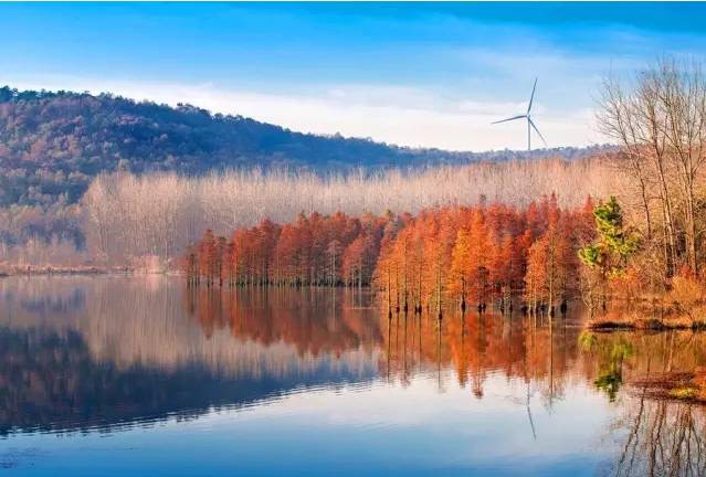 一年四季都很美,尤其是夏秋时节,阳光下的水杉就像一幅水彩画,湿地里偶有候鸟飞过,果然是“六合的九寨沟”。