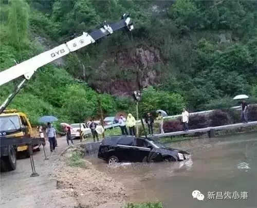 信息港网友 柠檬妹 爆料:“新昌巧英大雷村,车开进水塘“游泳”,只留下车顶,好在人没事爬出来了,车最后也被吊车吊上来了”