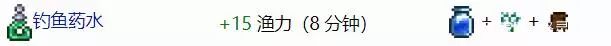 在众多药水里,有一瓶药水就可以增加渔力,而这瓶药水的名字叫做“钓鱼药水”,该药水的配方为水瓶、松脆蜂蜜块、幌菊,每一个配方所消耗的量都为1,而钓鱼药水制作的点有两个,一个是“放置的瓶子”,一个则是“炼药桌”。而钓鱼药水的具体效果则是为玩家提供8分钟的15渔力。