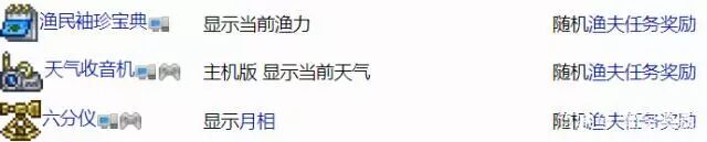 在《泰拉瑞亚》的世界中,玩家想要查看月相、渔力、天气,这三大元素时,查看的方法装备,而可以查看这三个元素的装备,刚刚好也有三个,它们分别是:
