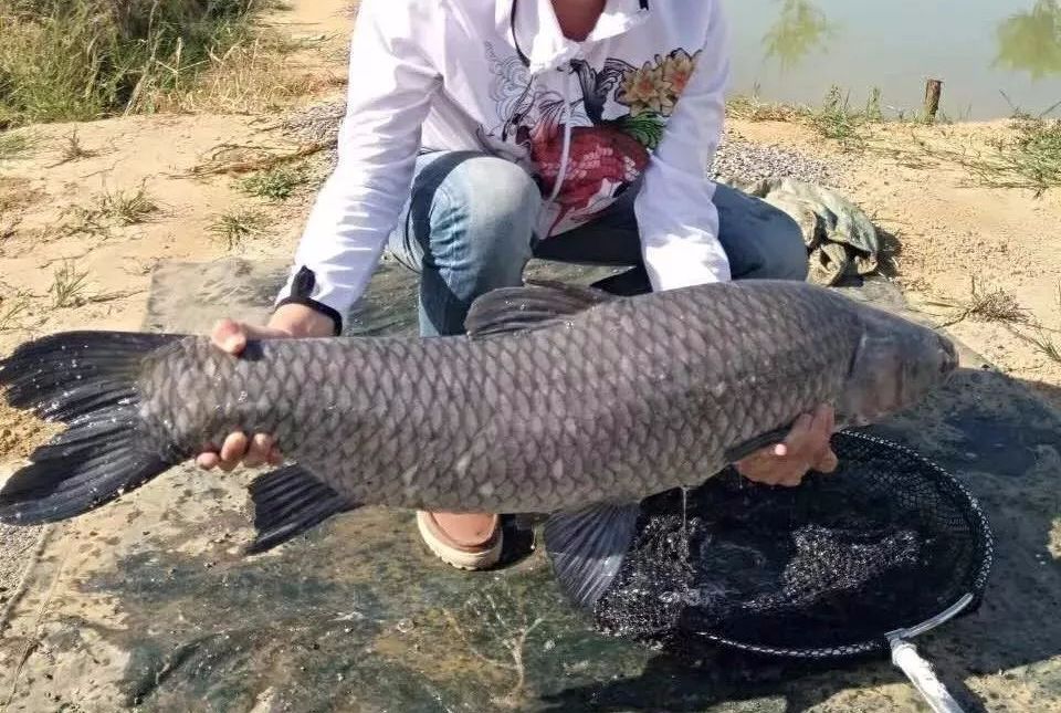 大概过了一个小时,突然之间黑漂了。拉到岸边一看,不是青鱼,居然是一条大概两斤重的鲤鱼!鲤鱼看起来肉质肥美,很鲜活,先收着吧。