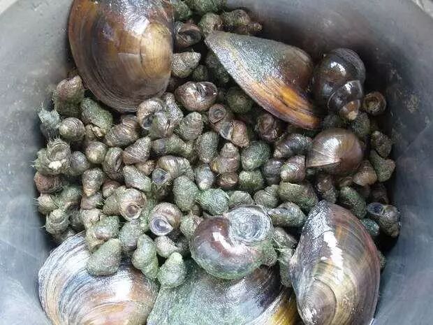 打窝的时候可以去用吖对不对。但是也不能全部打硬螺,要是青鱼来你窝子一看。卧槽,都踏马是硬螺。它咬不动吖转身就走了。所以也要掺一些脆螺,比例是2:1这么去打。挑大的打窝,小的留着钓。那种大的吃不进去的最好。
