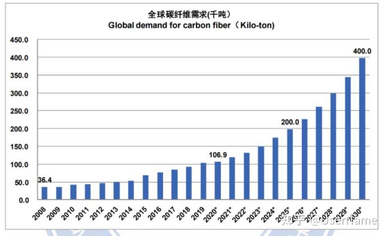 近年来碳纤维飞速发展,全球碳纤维复合材料市场规模不断扩大,据统计,2020年全球碳纤维需求量超过10万吨。