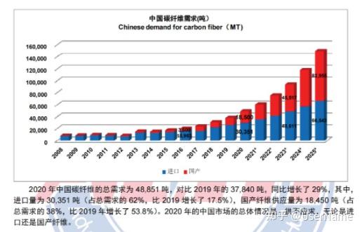 2020年中国碳纤维的总需求为48,851吨,对比2019年的37,840吨,同比增长了29%,其中,进口量为30,351吨(占总需求的62%,比2019增长了17.5%),国产纤维供应量为18,450吨(占总需求的38%,比2019年增长了53.8%)。2020年的中国市场的总体情况是:供不应求,无论是进口还是国产纤维。