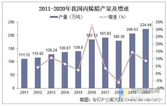 2011-2020年我国丙烯腈产量整体呈增长至趋势,据统计,截至2020年我国丙烯腈产量为224.44万吨,同比增长8.67%。